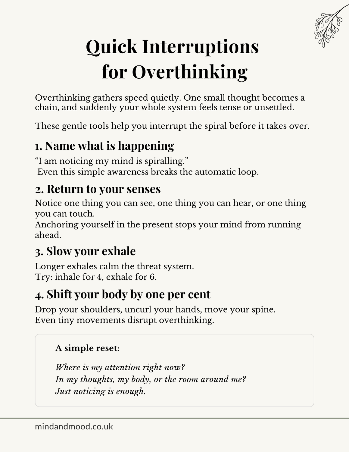 A simple set of grounding tools you can use anywhere when your mind starts spiralling. These gentle steps help you come back into your body, settle your nervous system, and stop overwhelm before it takes over.